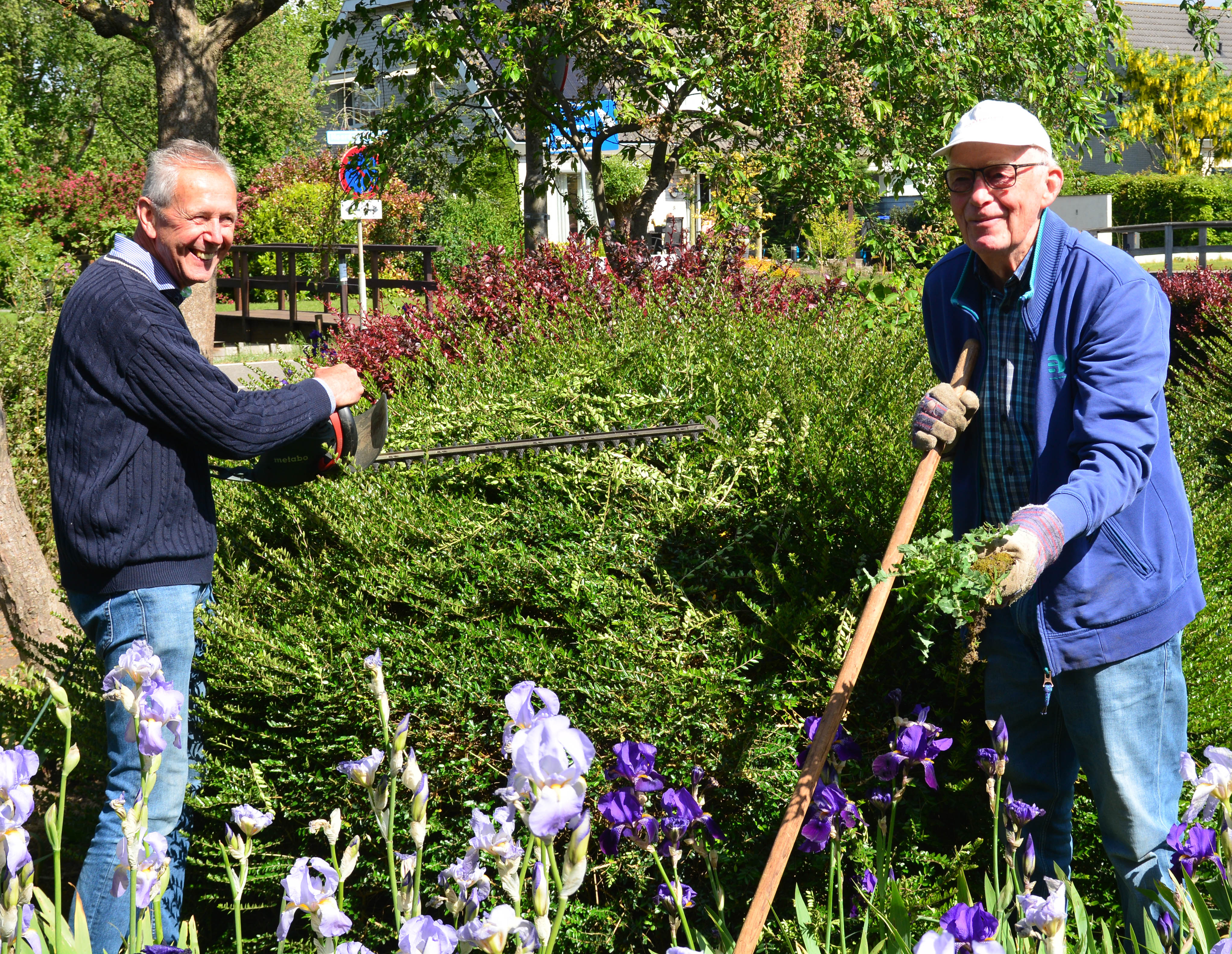 Als we in De Ark zijn om het filmpje voor de zondag op te nemen horen we opeens gestommel. Door de ramen heen zie ik mensen bij de fietsen. We gaan kijken en treffen daar twee gemeenteleden aan met een riek. Daarmee gaan ze de strijd aanbinden tegen het onkruid in de tuin. Ook de heg is aan een snoeibeurt toe. Wat is het toch geweldig dat allerlei zaken in deze tijd ook gewoon doorgang vinden. Dat er mensen zijn in onze kerkgemeenschap die ervoor zorgen dat de tuin er weer netjes bij ligt. Dat bijhouden van de tuin is een hele klus. Ik heb zelf geen groene vingers en houd helemaal niet van tuinieren, wel van mooie tuinen, maar dat terzijde. Mijn zo langzamerhand verloren strijd tegen het zevenblad in onze achtertuin geeft stof tot gesprek, maar helaas weinig hoop dat ik er ooit vanaf kom. Ik hoor het verhaal van hoe de irissen in onze tuin zijn beland. Ze staan die dag nog prachtig te bloeien.